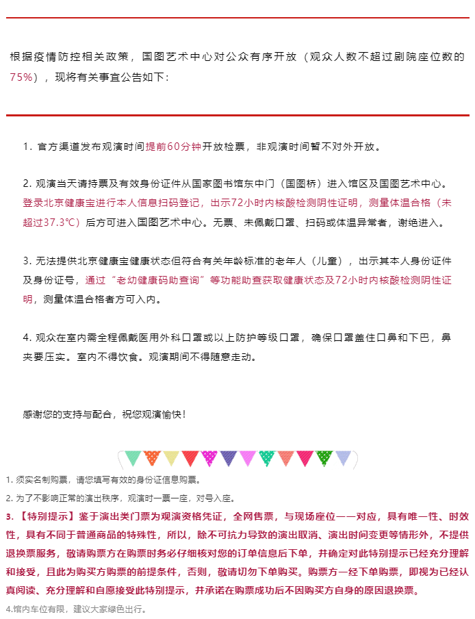 1.购买前请您提前规划好行程,做好相应准备,以免影响您的正常观演,感谢您的理解和配合。